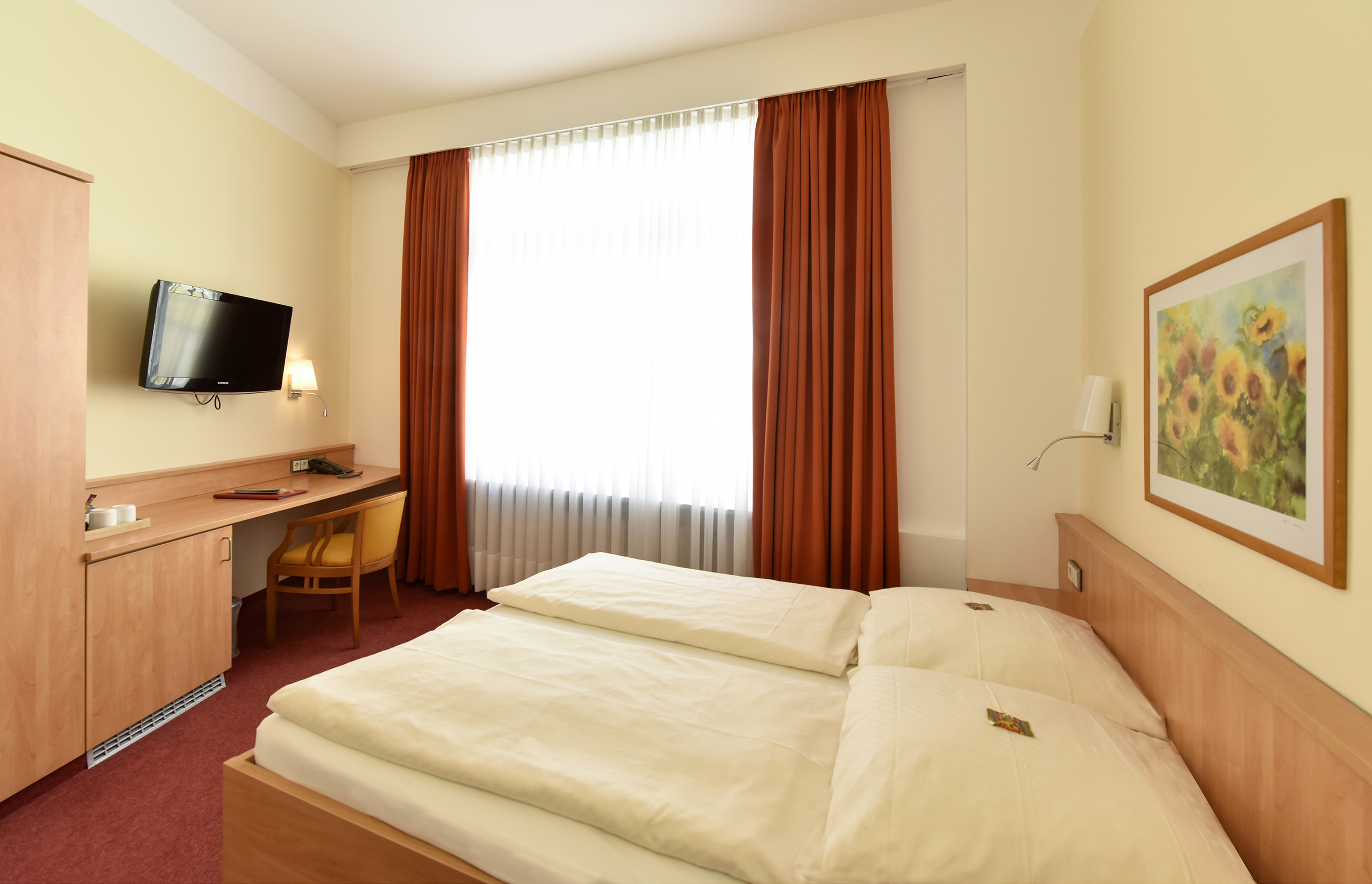 Unsere Doppelzimmer sind 16 bis 20 qm groß und mit einem französischen Bett (160 cm Breite) oder zwei getrennt stehenden Einzelbetten (TWIN-Kategorie) ausgestattet. Zimmer zur Einzelnutzung sind identisch ausgestattet und haben teilweise Einzelbetten.