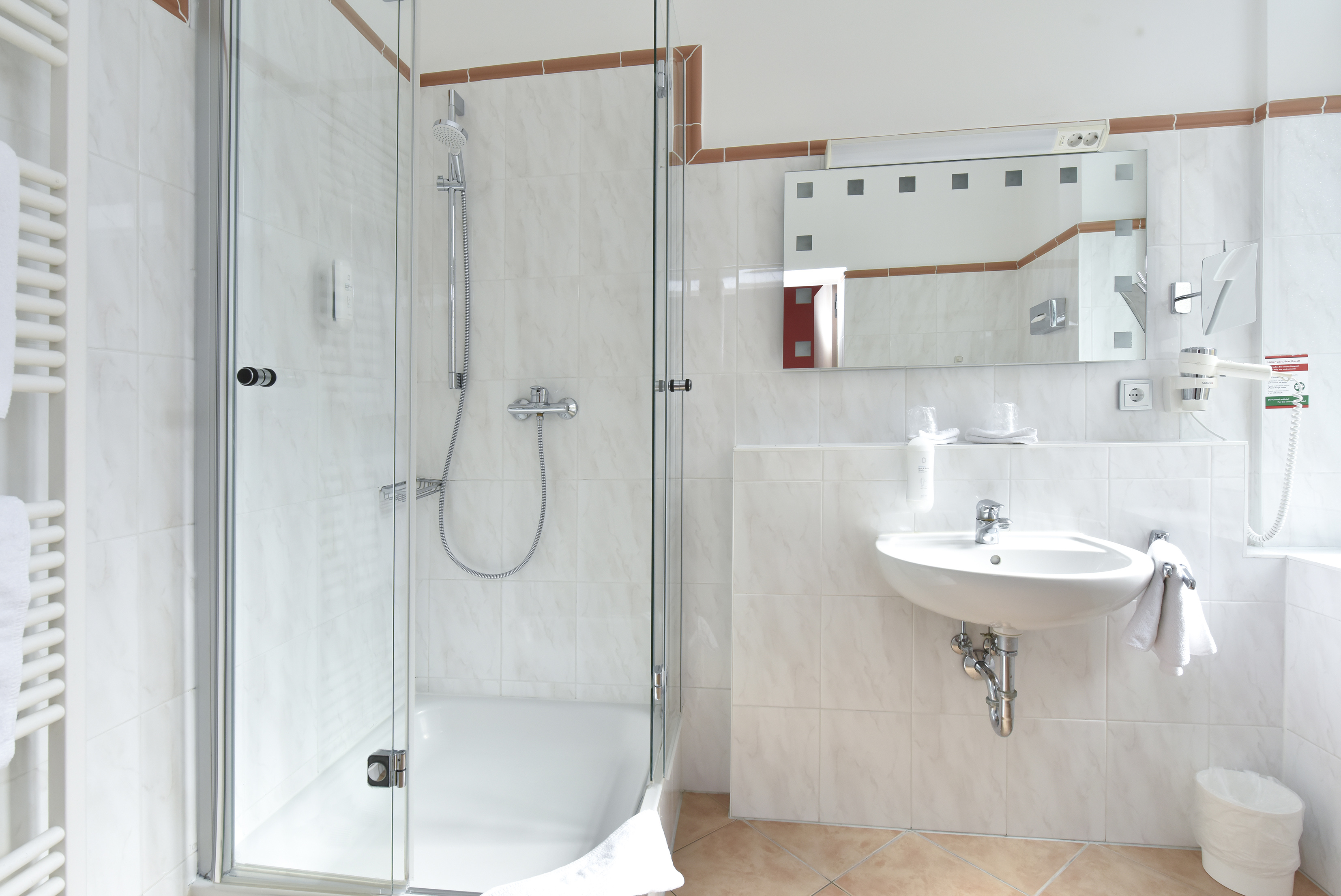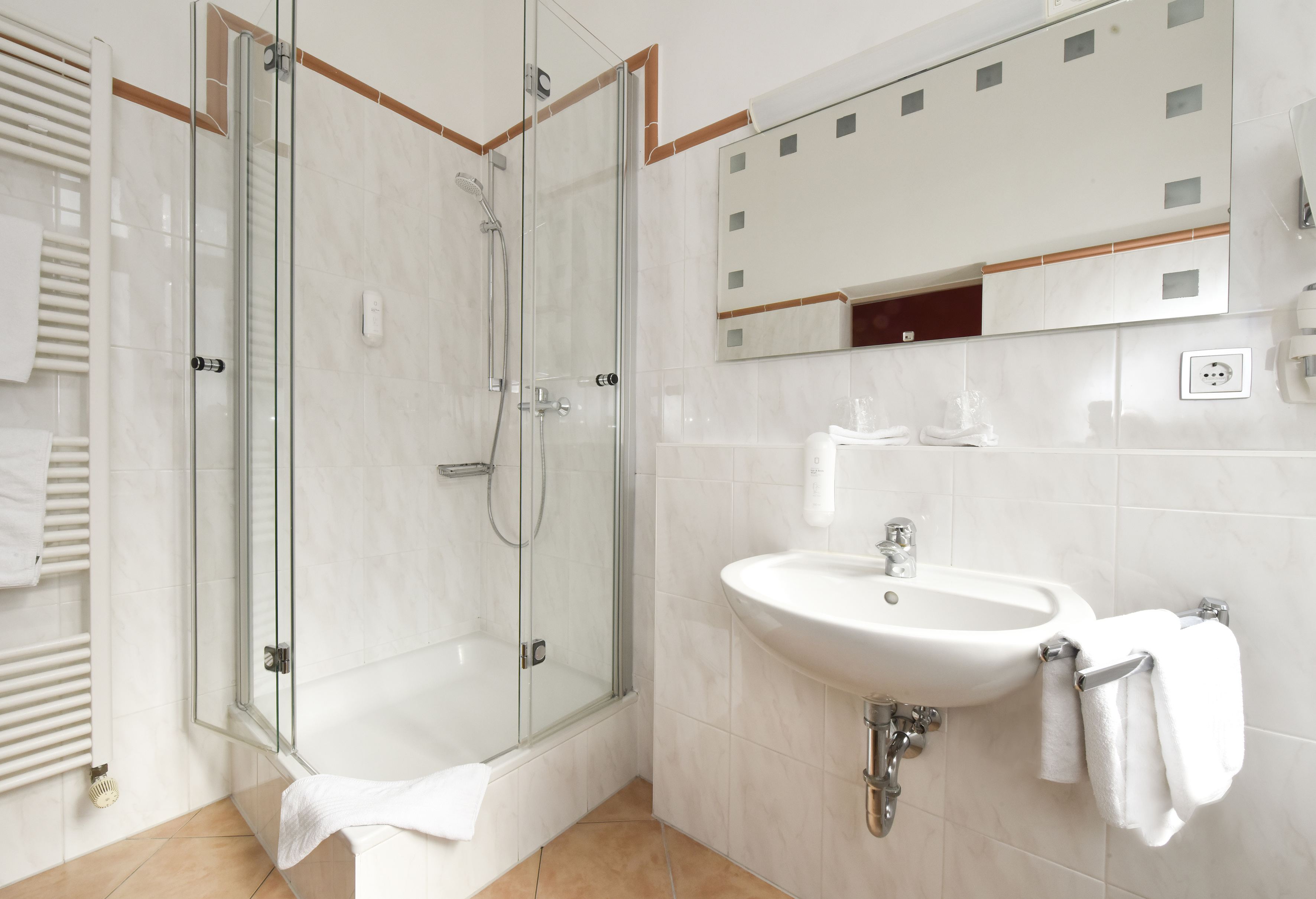 Die Bäder dieser Zimmerkategorie sind mit einer Dusche oder einer Badewanne ausgestattet.